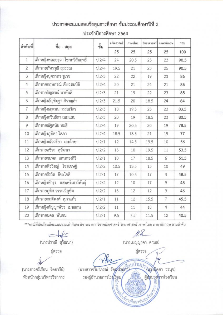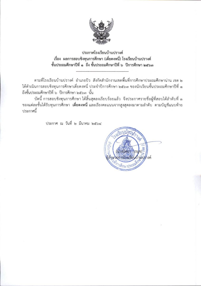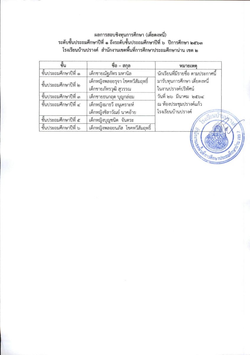 ประกาศผลการสอบชิงทุนการศึกษา โรงเรียนบ้านปรางค์ ระดับชั้นประถมศึกษาปีที่ 1 - ชั้นประถมศึกษาปีที่ 6 ปีการศึกษา 2563