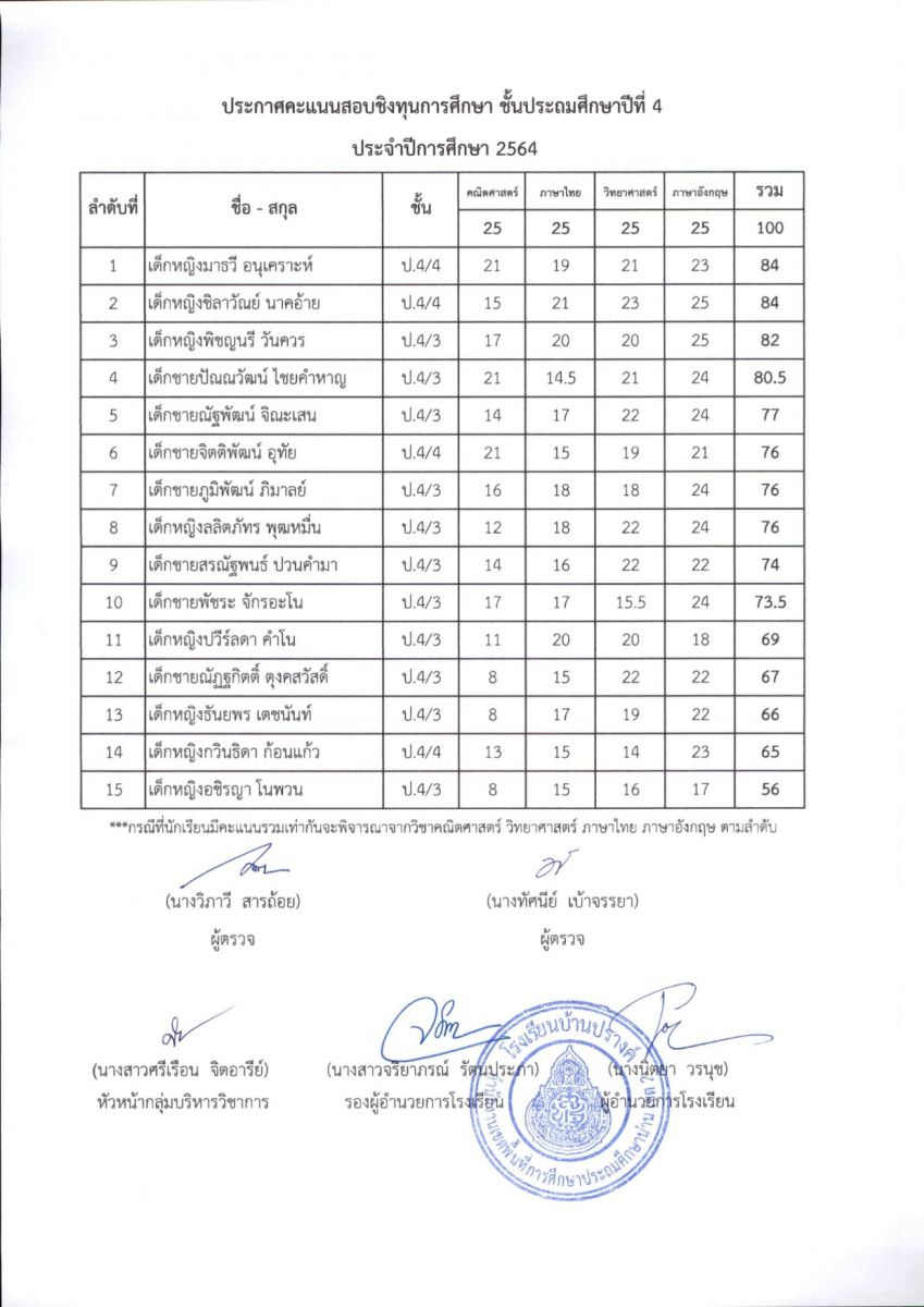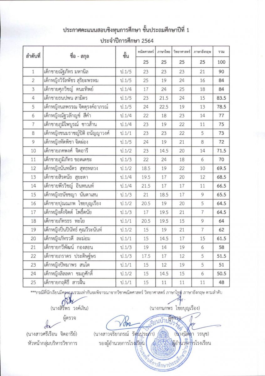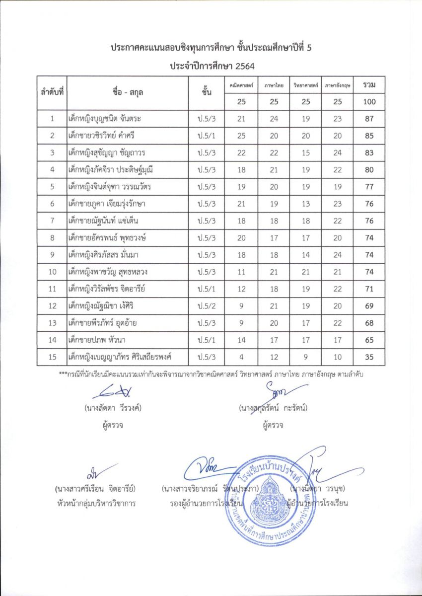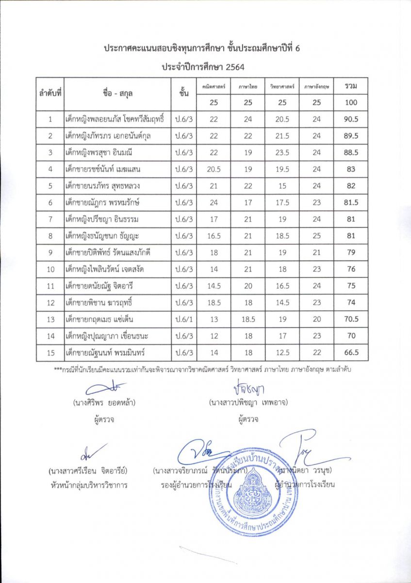 ประกาศผลการสอบชิงทุนการศึกษา โรงเรียนบ้านปรางค์ ระดับชั้นประถมศึกษาปีที่ 1 - ชั้นประถมศึกษาปีที่ 6 ปีการศึกษา 2563
