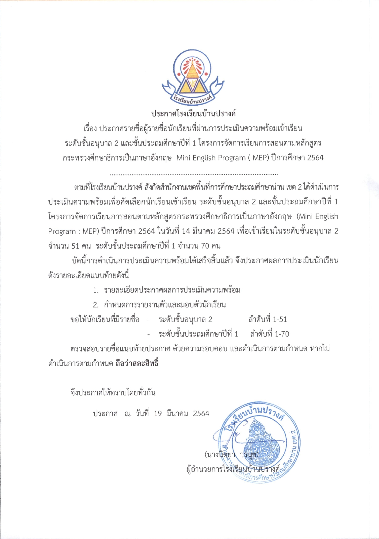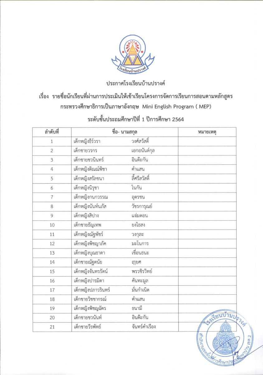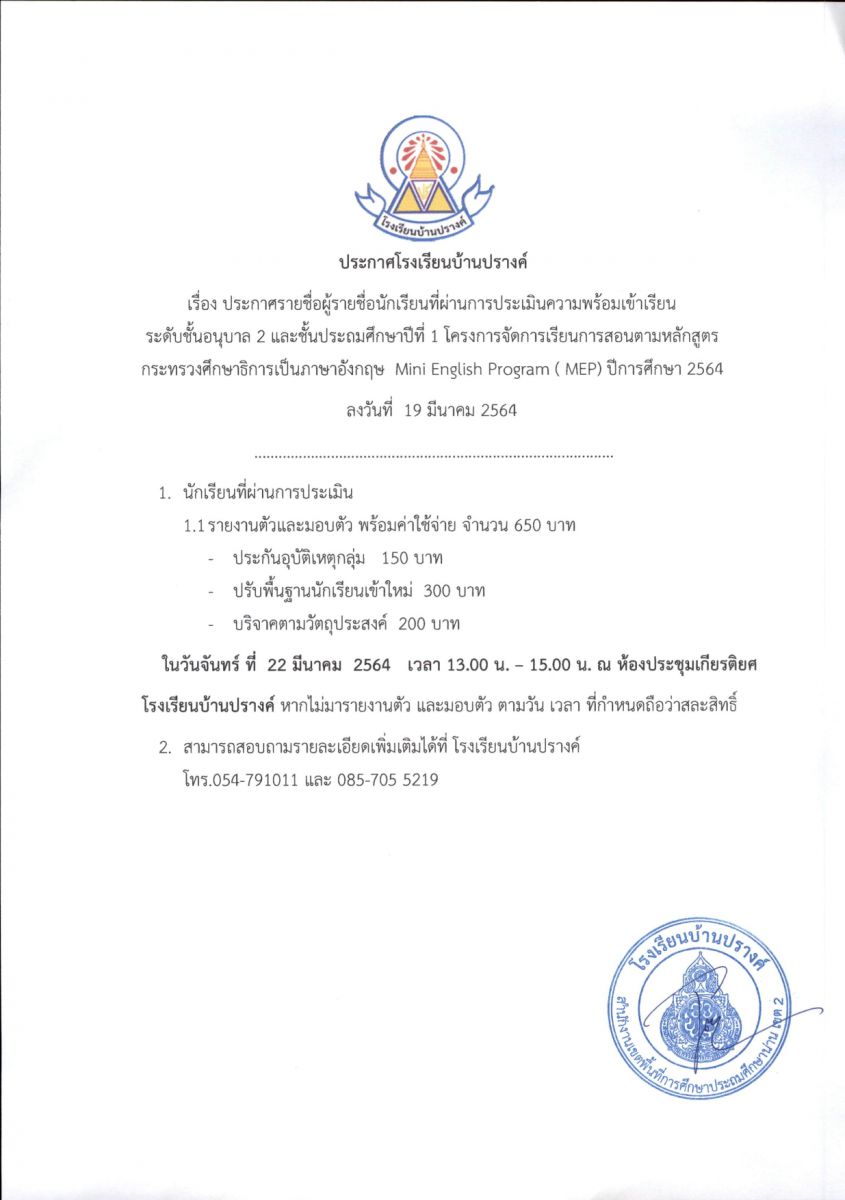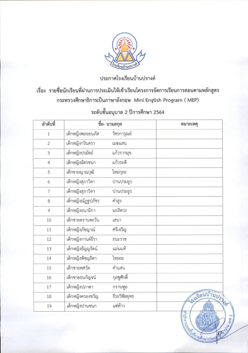 ประกาศรายชื่อนักเรียนที่ผ่านประเมินความพร้อมเข้าเรียน ระดับชั้นอนุบาล2 และชั้นประถมศึกษาปีที่1 โครงการจัดการเรียนการสอนตามหลักสูตรกระทรวงศึกษาธิการ เป็นภาษาอังกฤษ Mini English Program (MEP) ปีการศึก