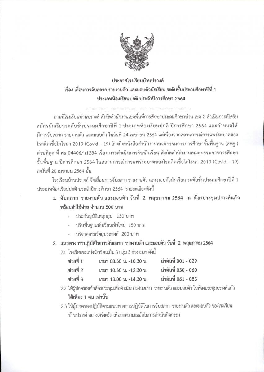 ประกาศโรงเรียนบ้านปรางค์ เรื่อง เลื่อนการจับสลาก รายงานตัว และมอบตัวนักเรียน ระดับชั้นประถมศึกษาปีที่ 1 ประเภทห้องเรียนปกติ ประจำปีการศึกษา 2564