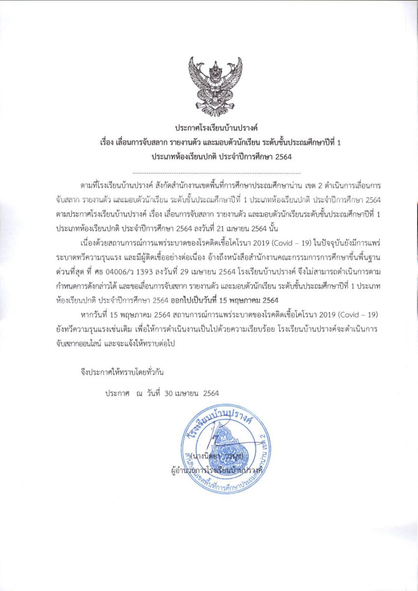 ประกาศโรงเรียนบ้านปรางค์ เรื่อง เลื่อนการจับสลาก รายงานตัว และมอบตัวนักเรียน ระดับชั้นประถมศึกษาปีที่ 1 ประเภทห้องเรียนปกติ ประจำปีการศึกษา 2564