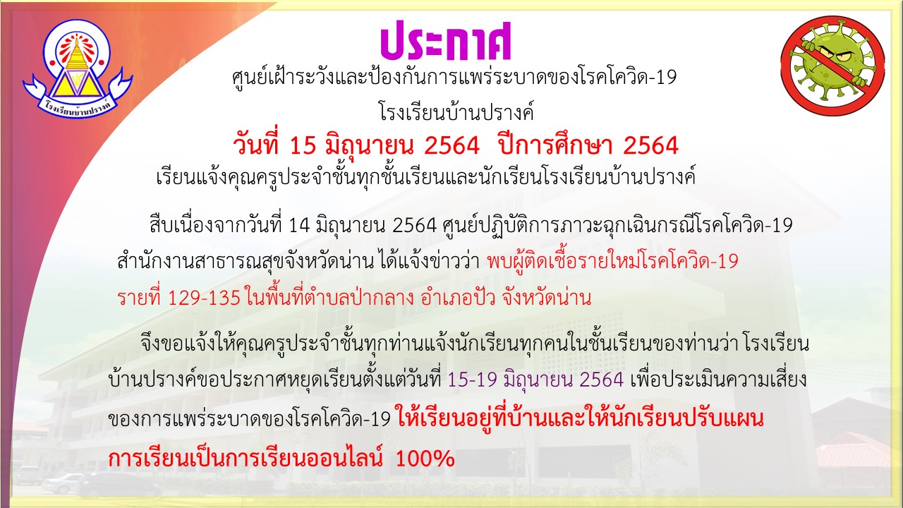 ประกาศหยุดเรียนกรณีพิเศษ 15-19 มิถุนายน 2564
