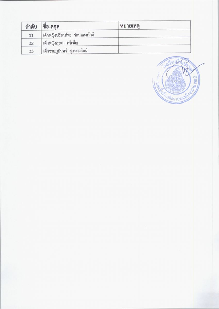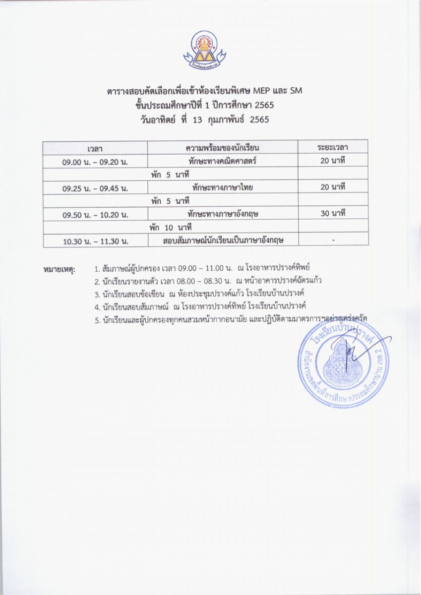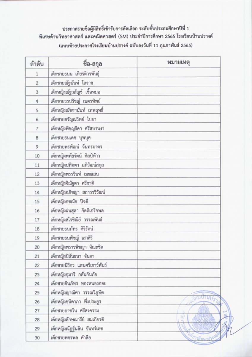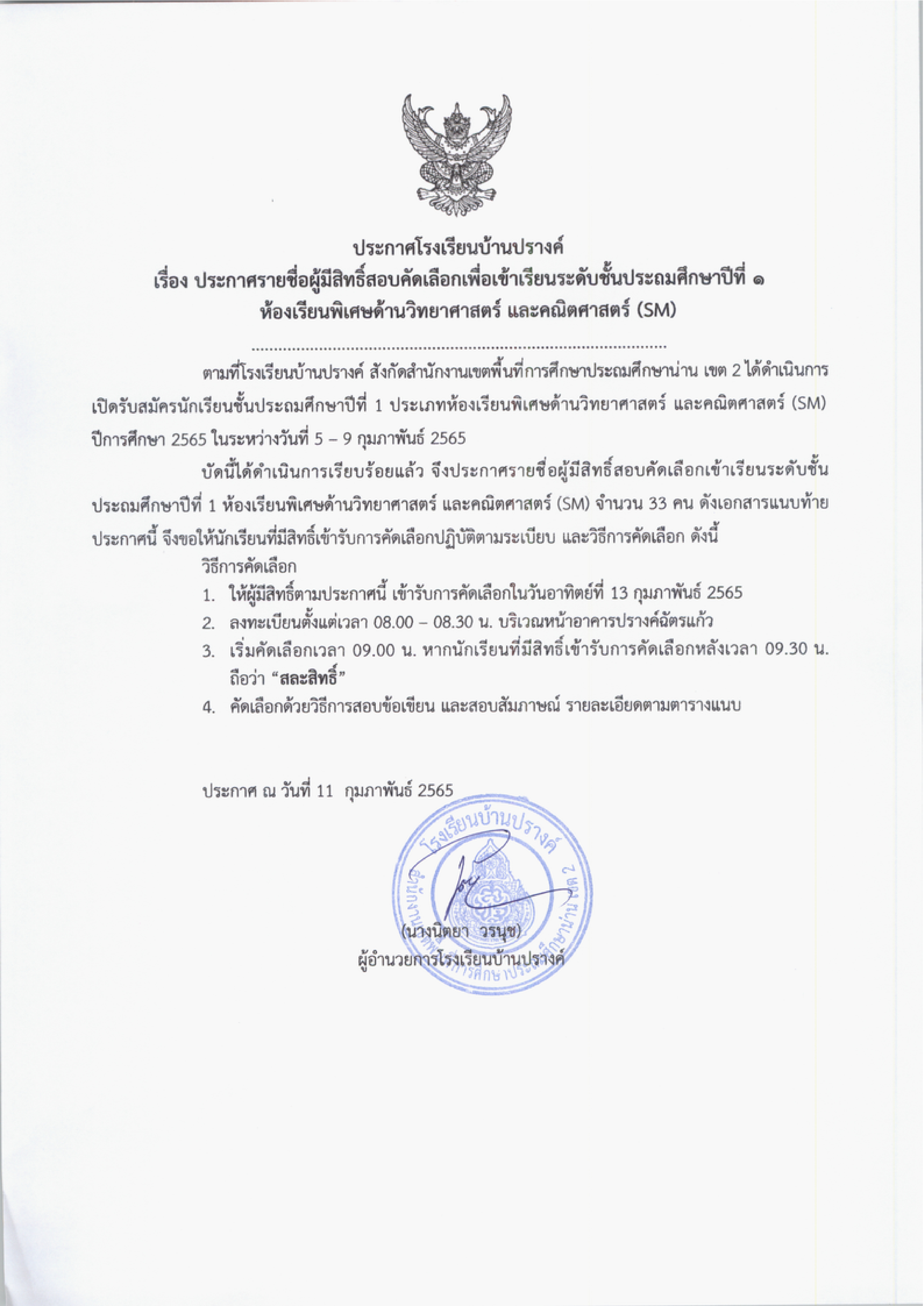 ประกาศรายชื่อผู้มีสิทธิ์สอบคัดเลือกเพื่อเข้าศึกษาต่อในระดับชั้นประถมศึกษาปีที่ 1 ห้องเรียนพิเศษด้านวิทยาศาสตร์และคณิตศาสตร์ (SM)