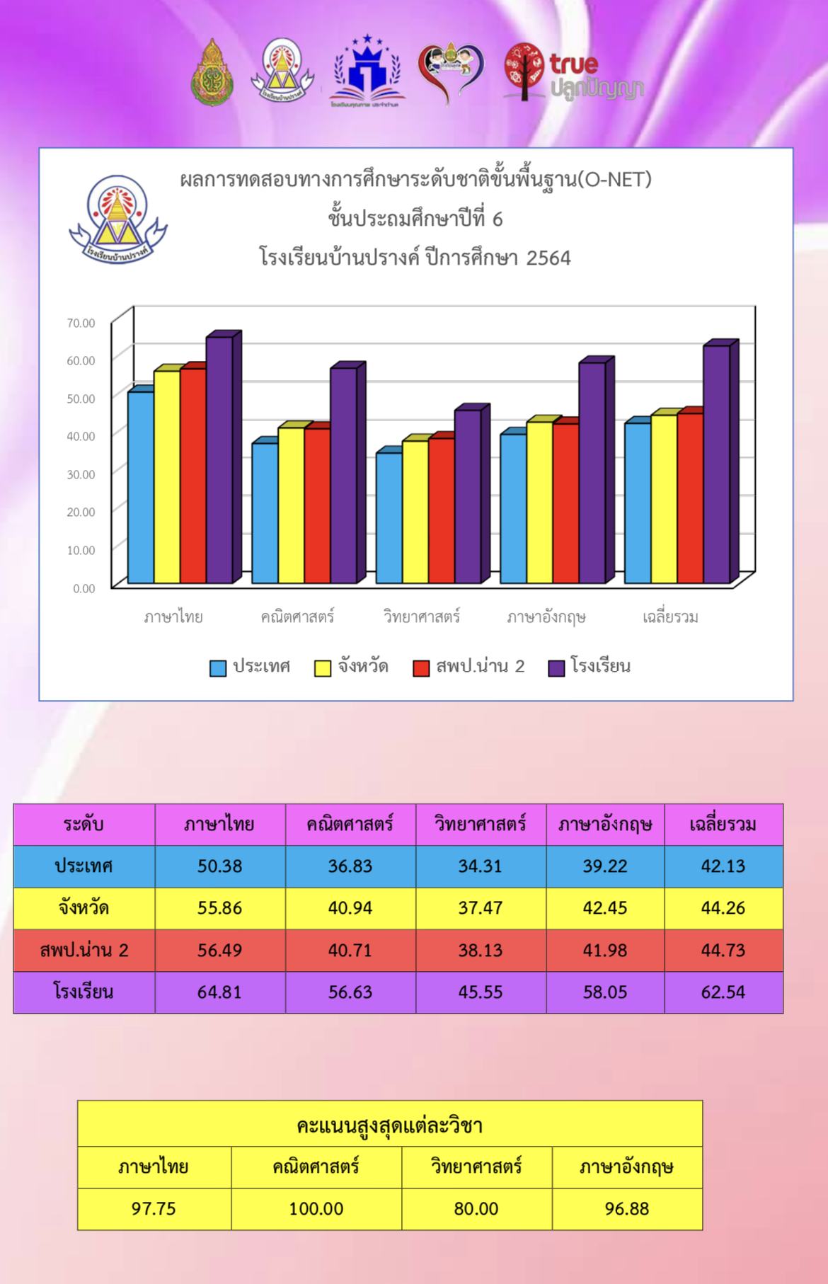 ผลการทดสอบทางการศึกษาระดับชาติขั้นพื้นฐาน (O-NET) ชั้นประถมศึกษาปีที่ 6 ปีการศึกษา 2564