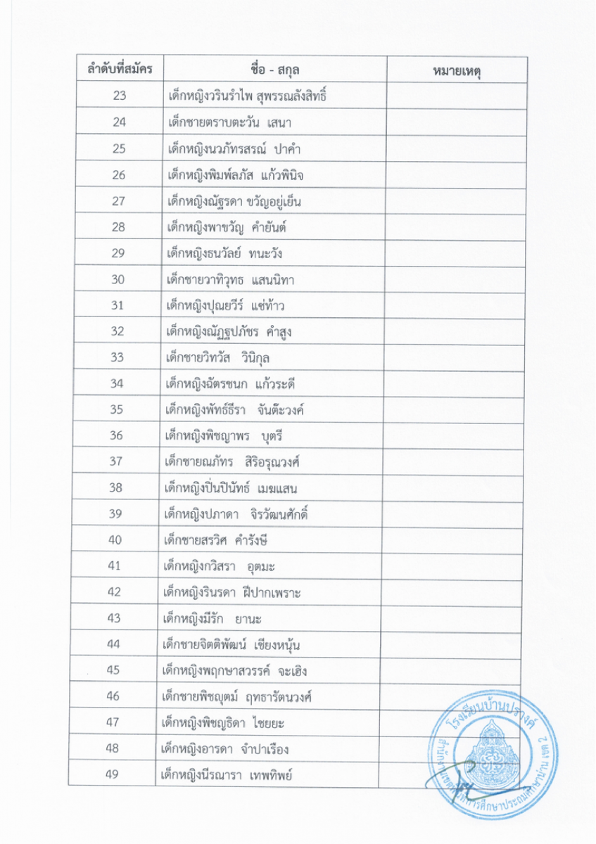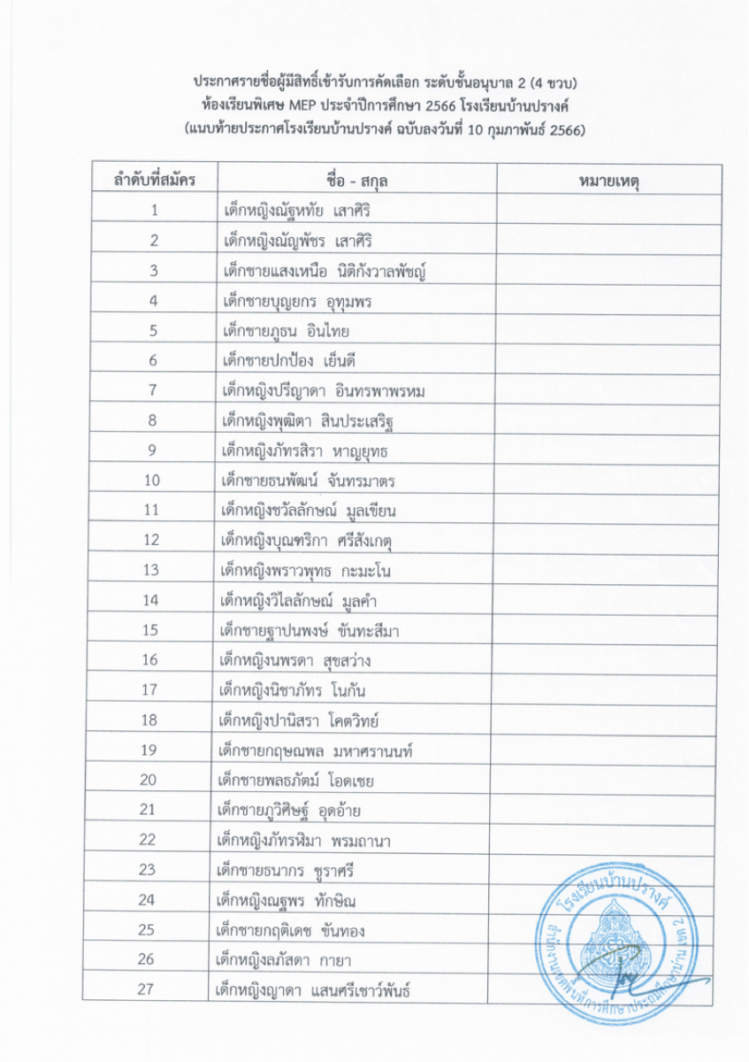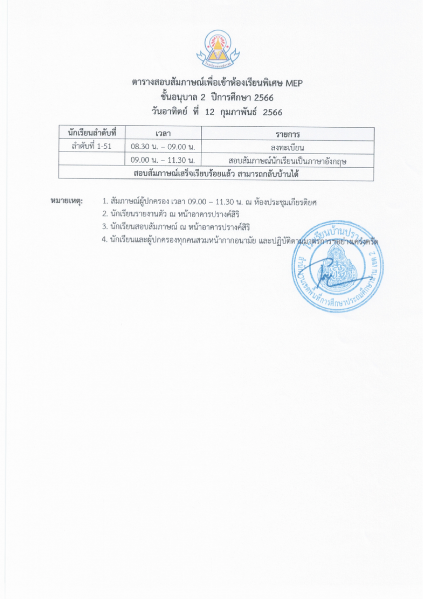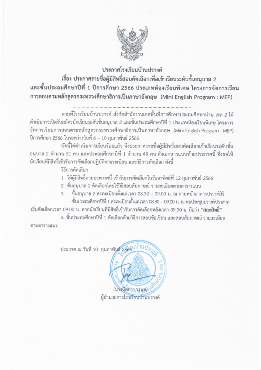 ประกาศรายชื่อผู้มีสิทธิ์สอบคัดเลือกเพื่อเข้าเรียนระดับชั้นอนุบาล 2 และชั้นประถมศึกษาปีที่ 1 ปีการศึกษา 2566 ประเภทห้องเรียนพิเศษ (Mini English Program:MEP)