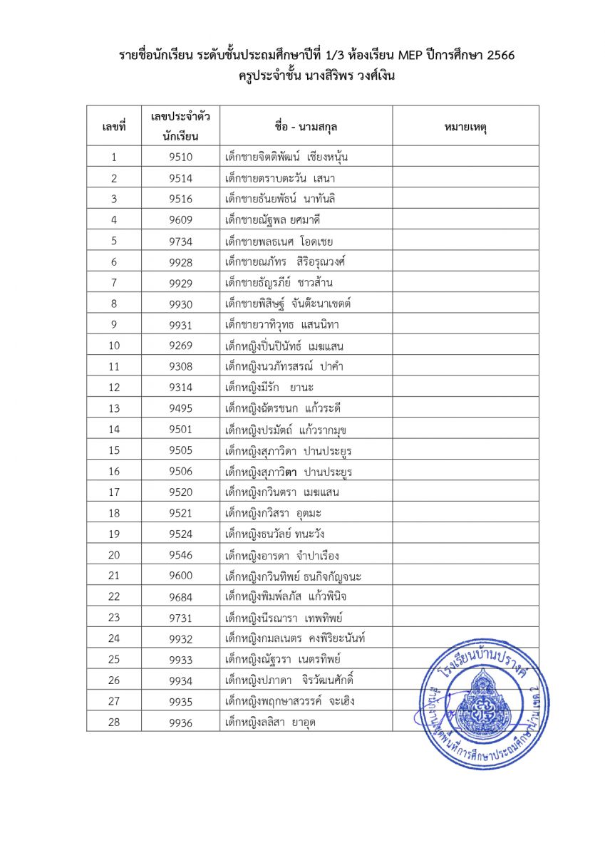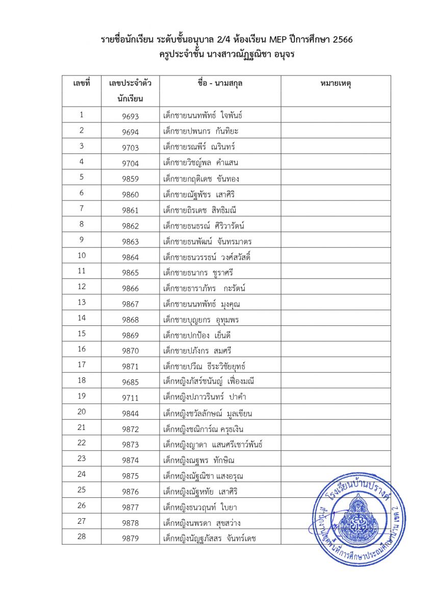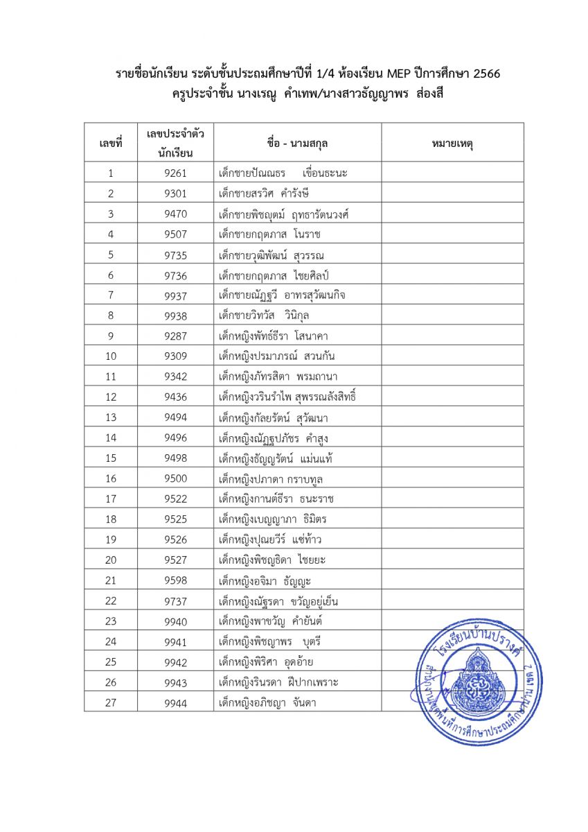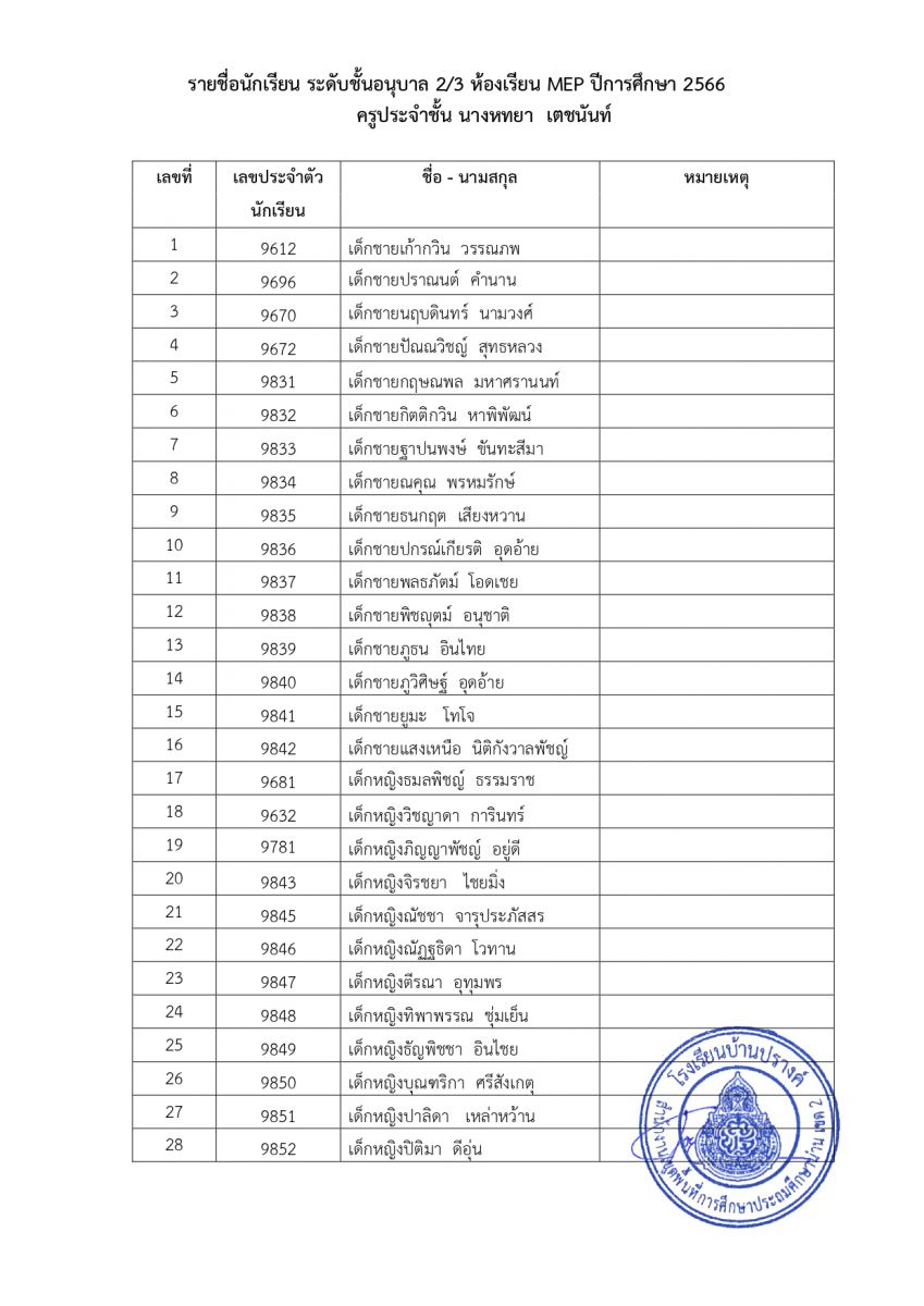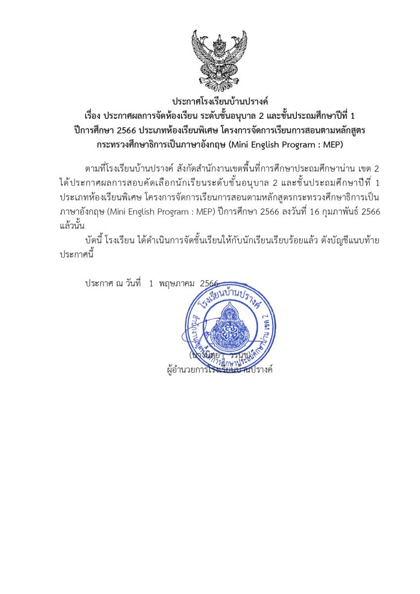 ประกาศผลการจัดห้องเรียน ระดับชั้นอนุบาล 2 และชั้นประถมศึกษาปีที่ 1 ปีการศึกษา 2566 ประเภทห้องเรียนพิเศษ โครงการจัดการเรียนการสอนตามหลักสูตรกระทรวงศึกษาธิการเป็นภาษาอังกฤษ (Mini English Program : MEP)