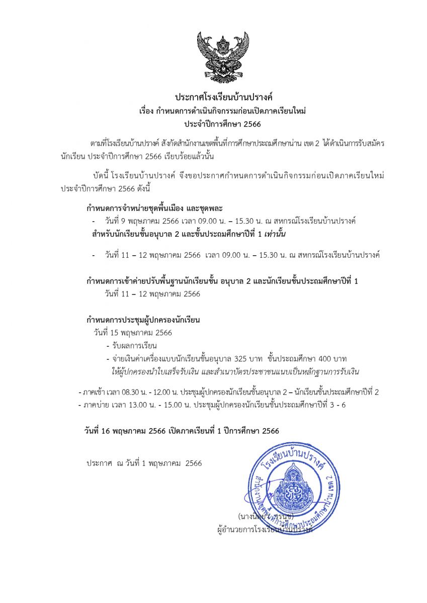 ประกาศกำหนดการดำเนินการก่อนเปิดภาคเรียนใหม่ ประจำปีการศึกษา 2566