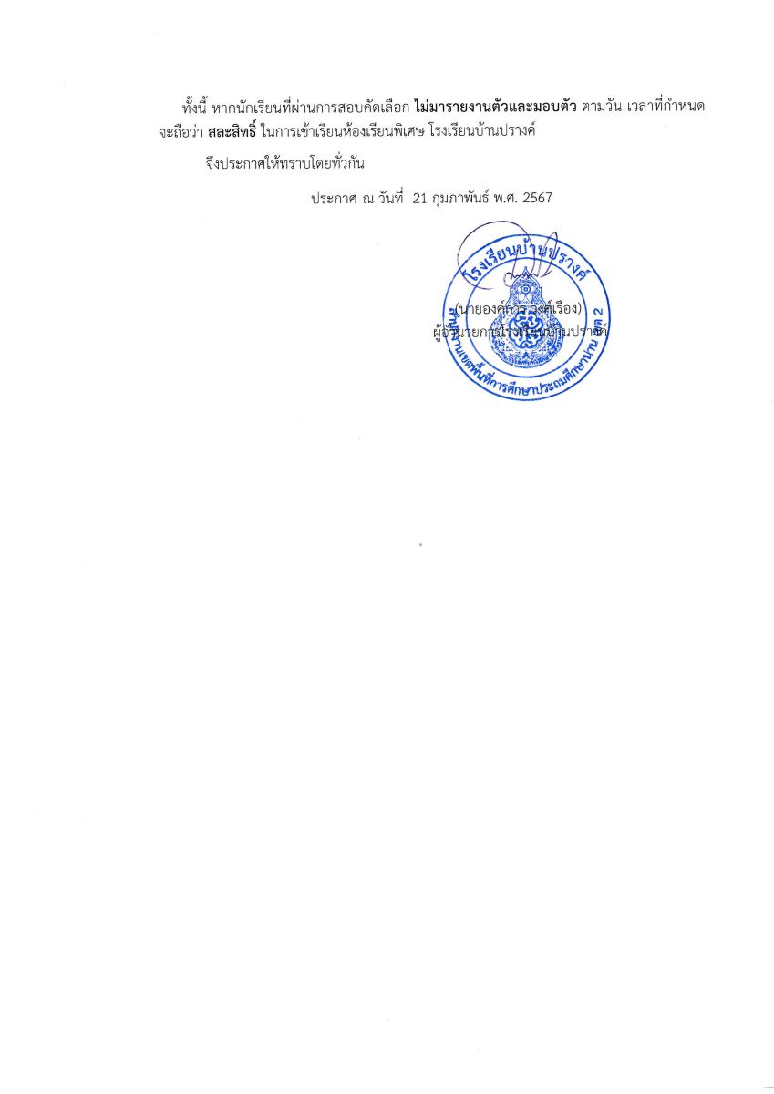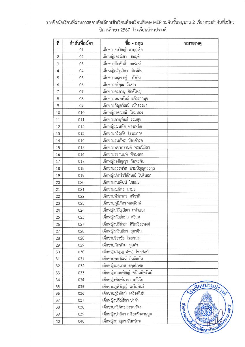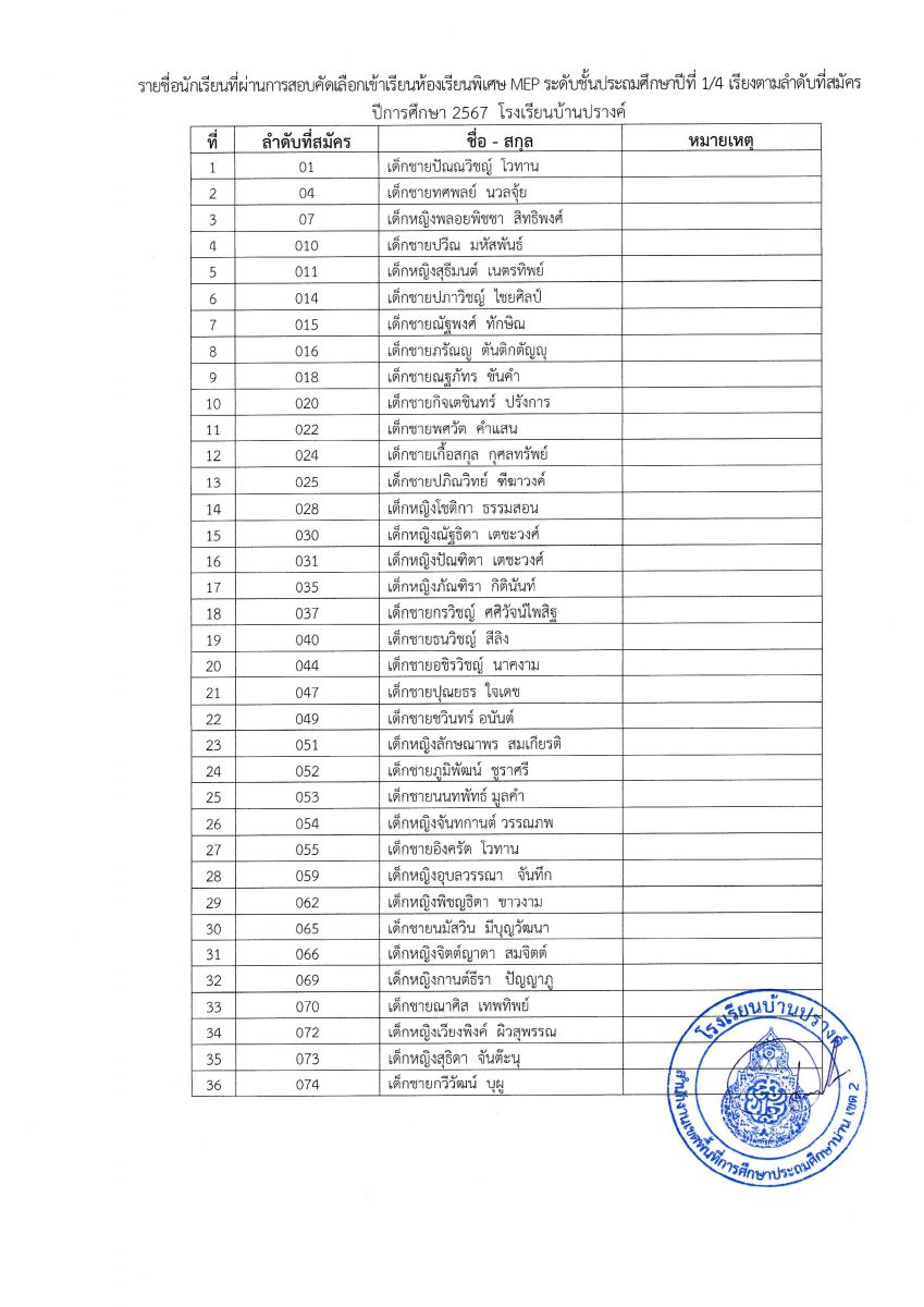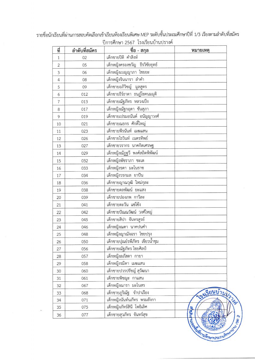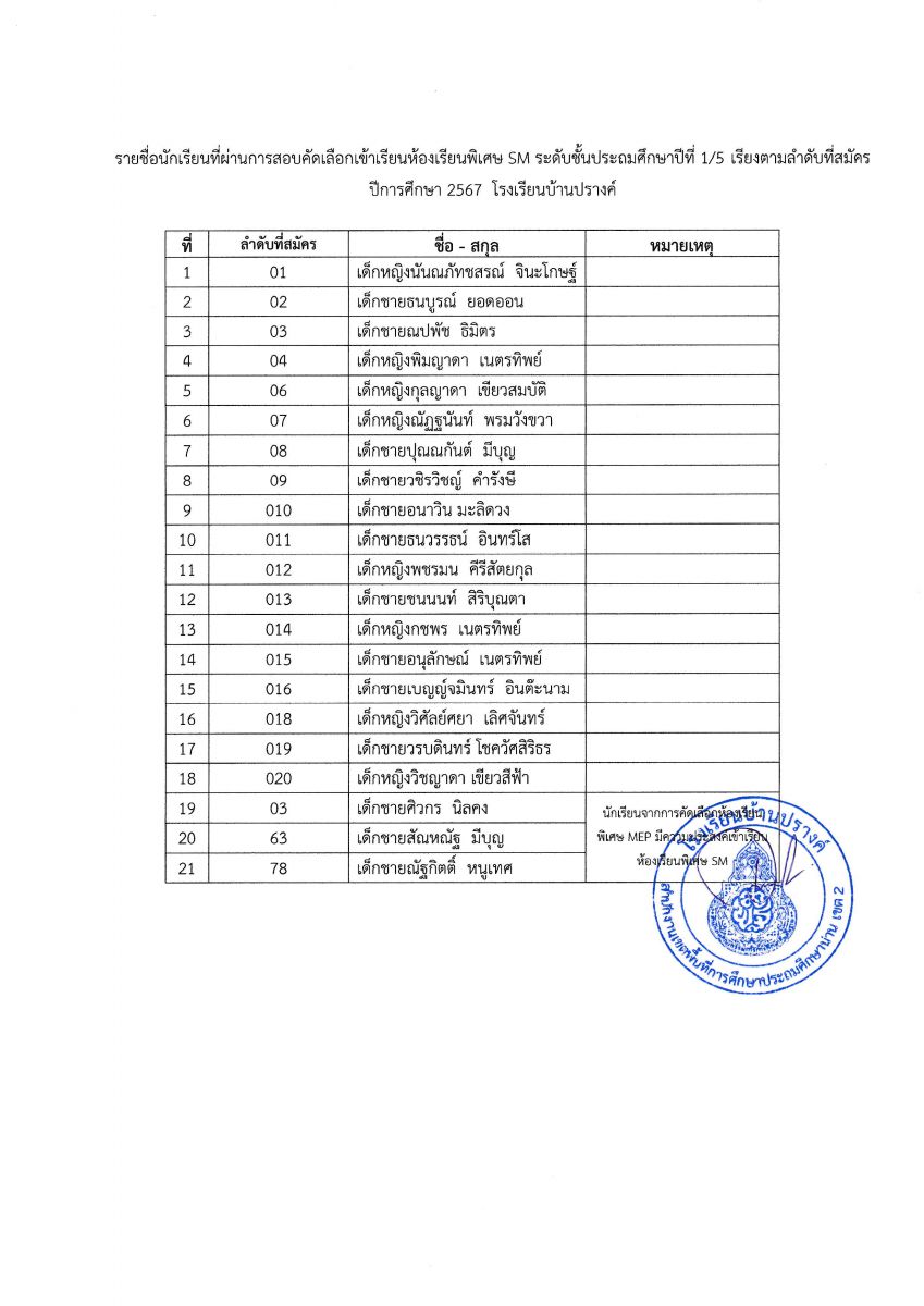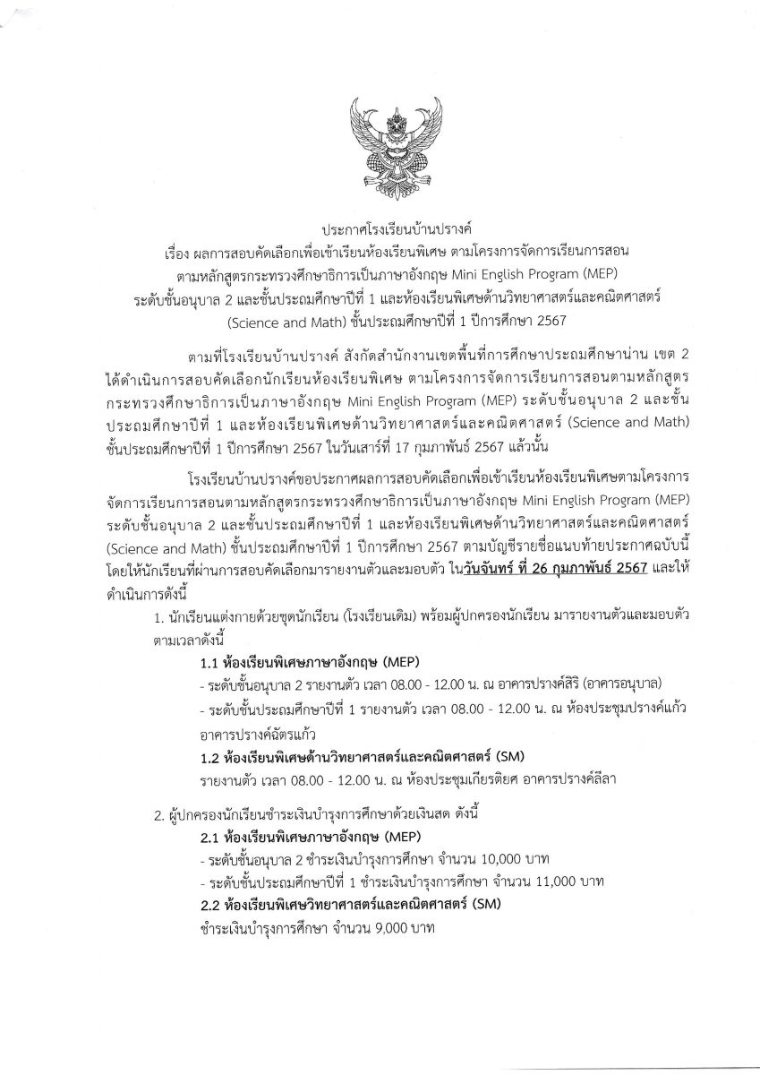 ประกาศผลการสอบคัดเลือกเพื่อเข้าห้องเรียนพิเศษ (MEP) และห้องเรียนพิเศษด้านวิทยาศาสตร์และคณิตศาสตร์ (SM) ระดับชั้นอนุบาล และระดับชั้นประถมศึกษาปีที่ 1