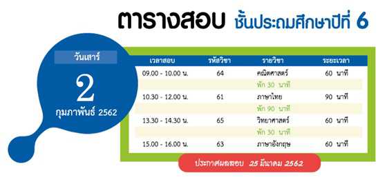 สำหรับในปีการศึกษา 2561 นี้ การสอบ O-NET ของนักเรียนชั้นประถมศึกษาปีที่ 6 จะจัดสอบขึ้นในวันเสาร์ที่ 2 เดือนกุมภาพันธ์ 2562 ดังตารางต่อไปนี้