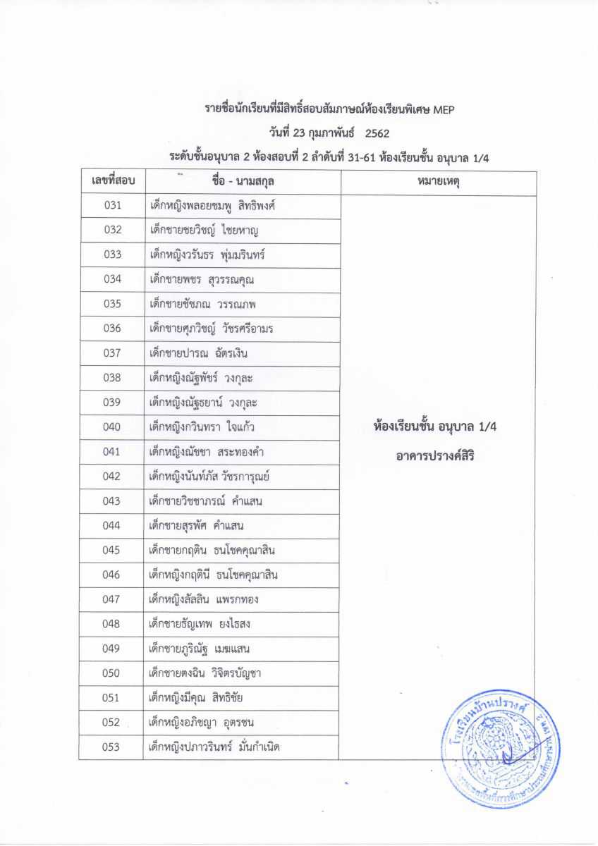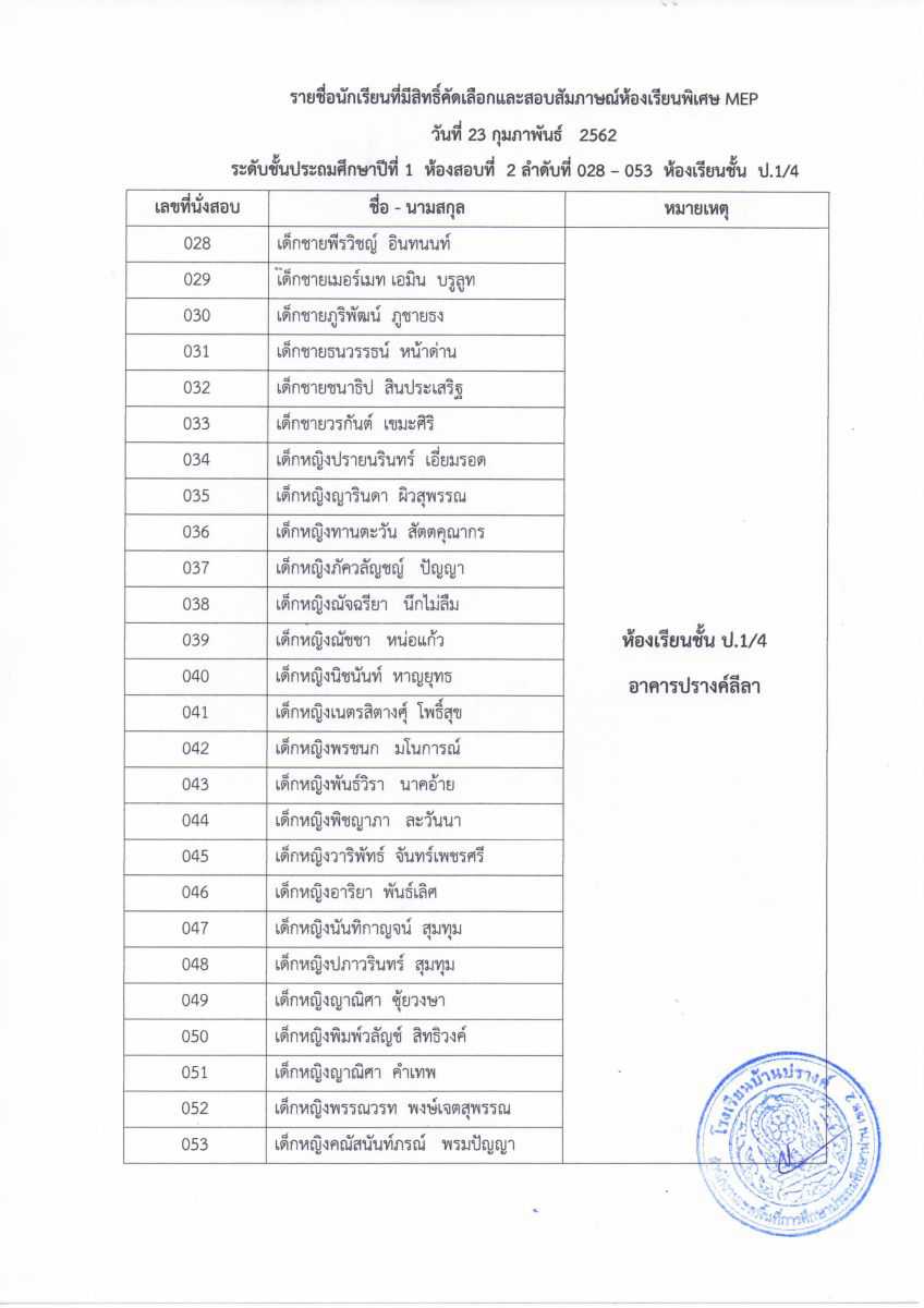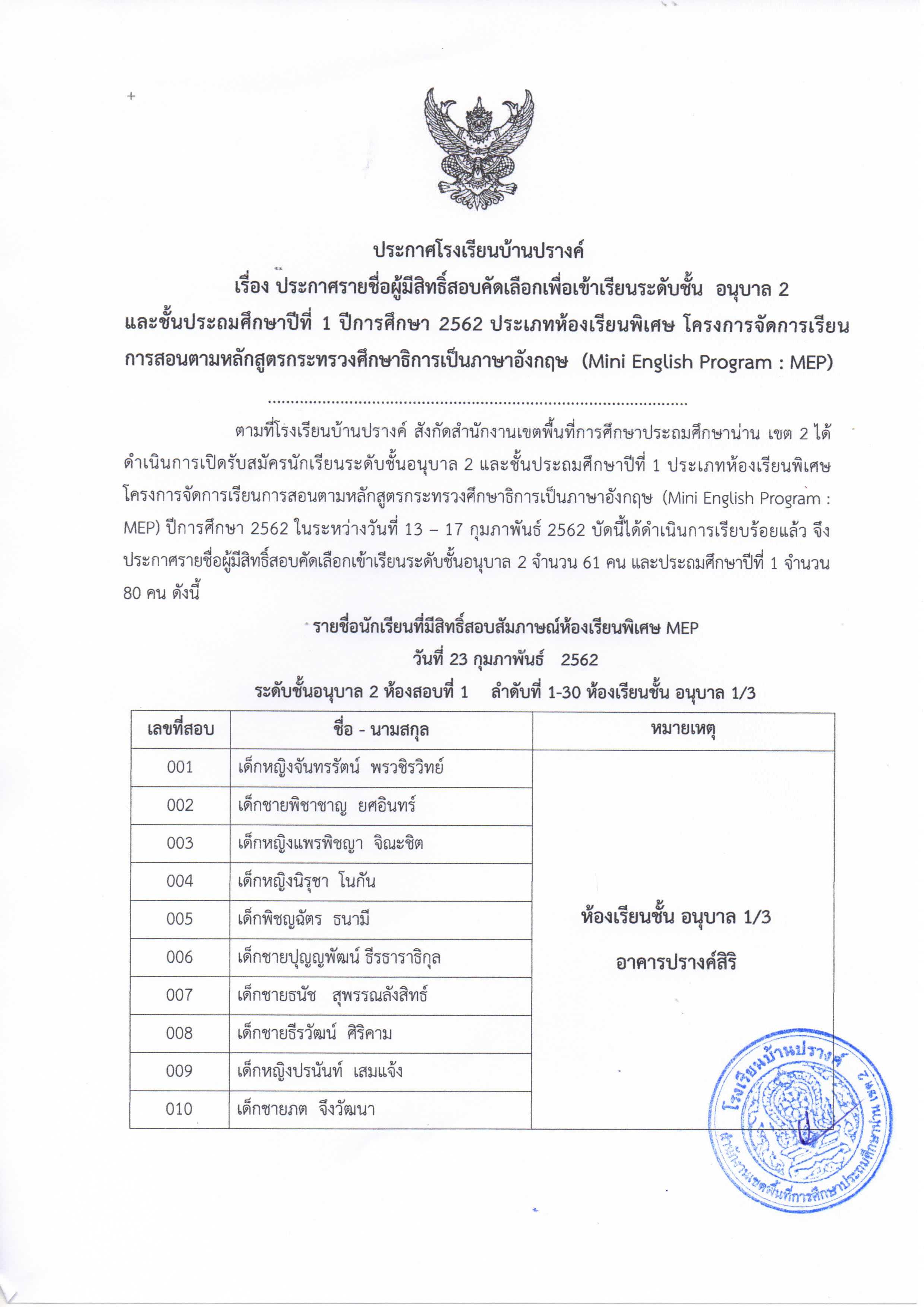 ประกาศรายชื่อผู้มีสิทธิ์สอบระดับชั้นอนุบาล 2 และชั้นประถมศึกษาปีที่ 1 ห้องเรียน MEP ในวันที่ 23 กุมภาพันธ์ 2562