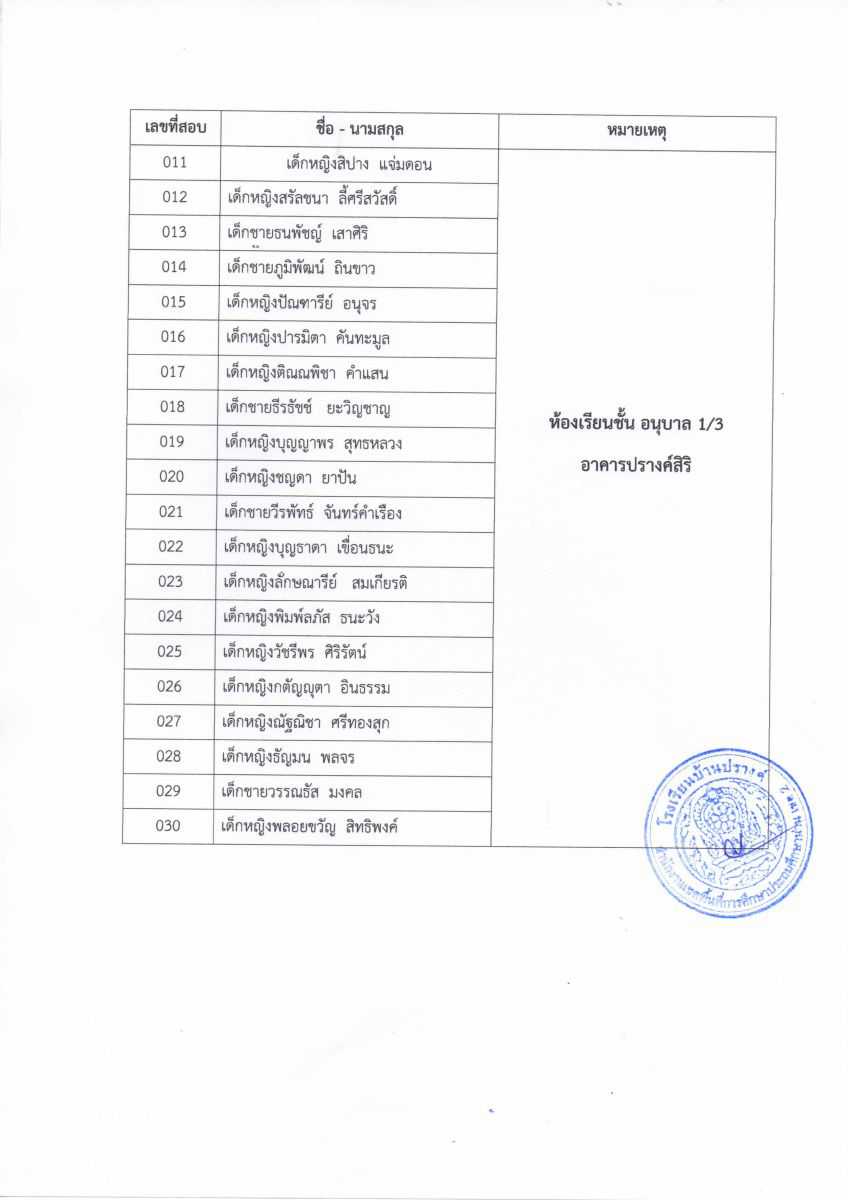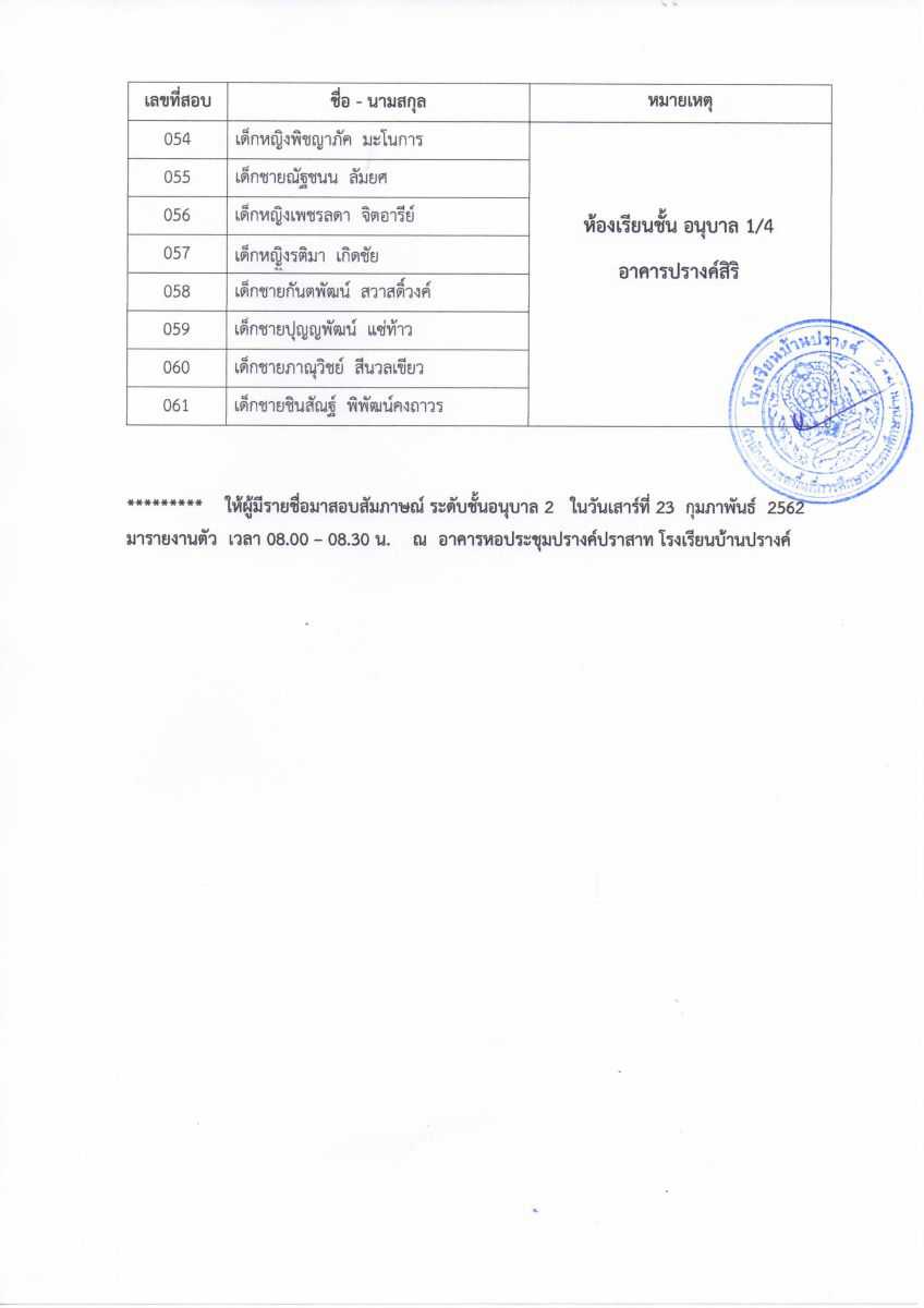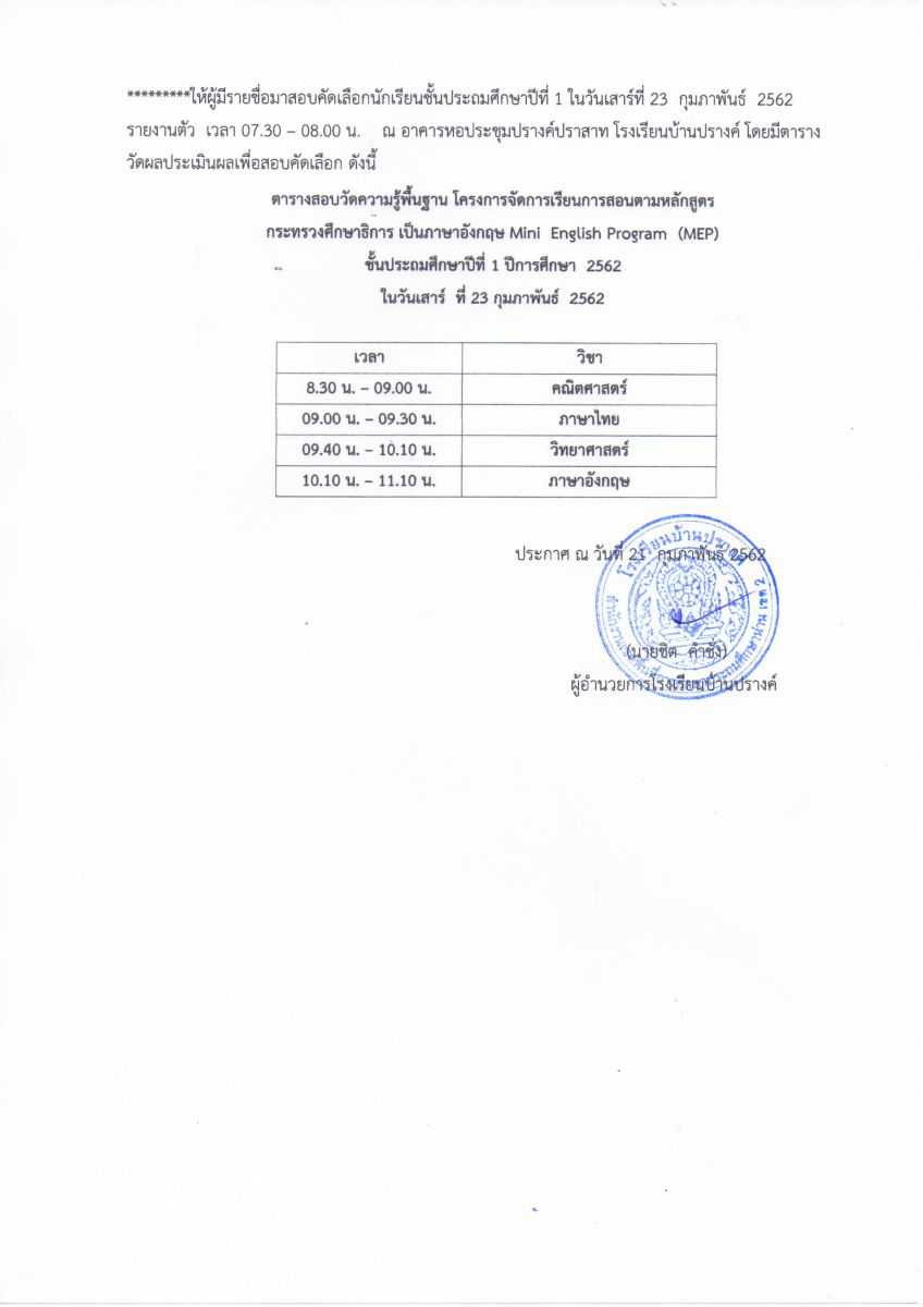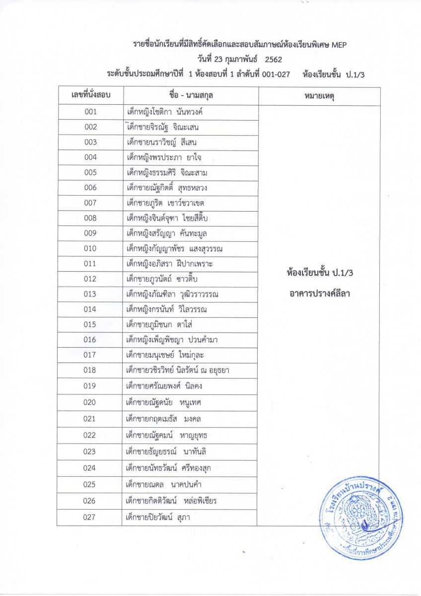 ประกาศรายชื่อผู้มีสิทธิ์สอบระดับชั้นอนุบาล 2 และชั้นประถมศึกษาปีที่ 1 ห้องเรียน MEP ในวันที่ 23 กุมภาพันธ์ 2562