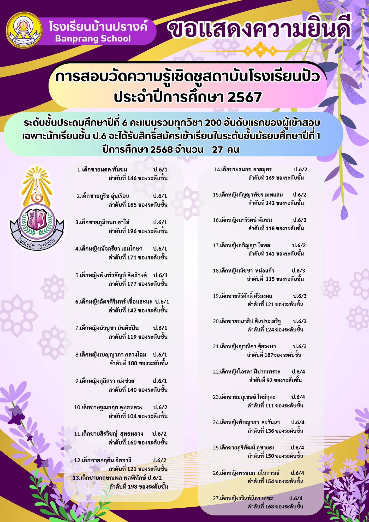 ขอแสดงความยินดีกับนักเรียนระดับชั้นประถมศึกษาปีที่ 6 มีคะแนนรวมทุกวิชา 200 อันดับแรก การสอบวัดความรู้เชิดชูสถาบัน โรงเรียนปัวประจำปีการศึกษา 2567