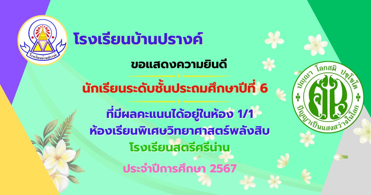 ขอแสดงความยินดีกับนักเรียนชั้นประถมศึกษาปีที่ 6 ที่ได้เลือกเข้าห้องเรียน 1/1 ห้องเรียนพิเศษวิทยาศาสตร์พลังสิบ การสอบวัดความรู้โรงเรียนสตรีศรีน่าน