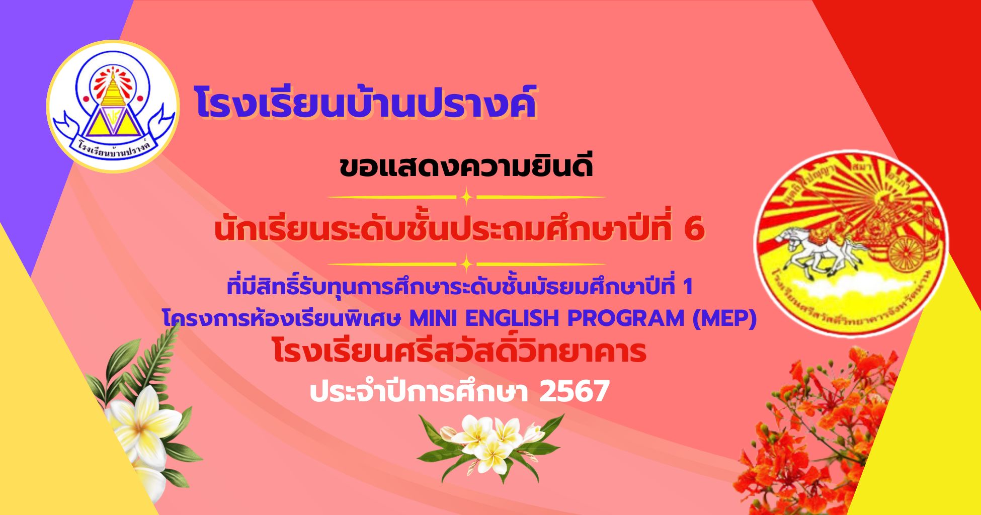 ขอแสดงความยินดีกับนักเรียนที่มีสิทธิ์รับทุนการศึกษาระดับชั้นมัธยมศึกษาปีที่ 1 โครงการห้องเรียนพิเศษ Mini English Program (MEP) ในการสอบวัดความรู้ความสามารถทางวิชาการ โรงเรียนศรีสวัสดิ์วิทยาคาร