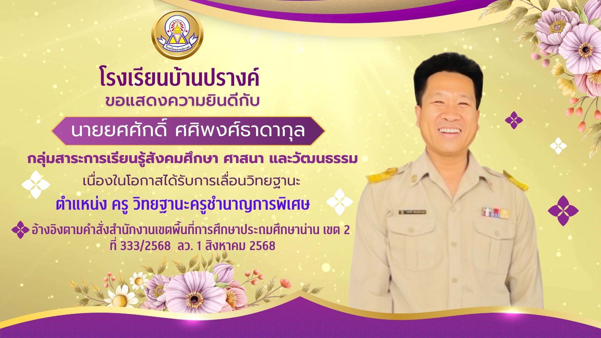 ขอแสดงความยินดีกับคุณครูยศศักดิ์ ศศิพงศ์ธาดากุล เนื่องในโอกาสได้รับการเลื่อนวิทยฐานะตำแหน่ง ครู วิทยฐานะครูชำนาญการพิเศษ
