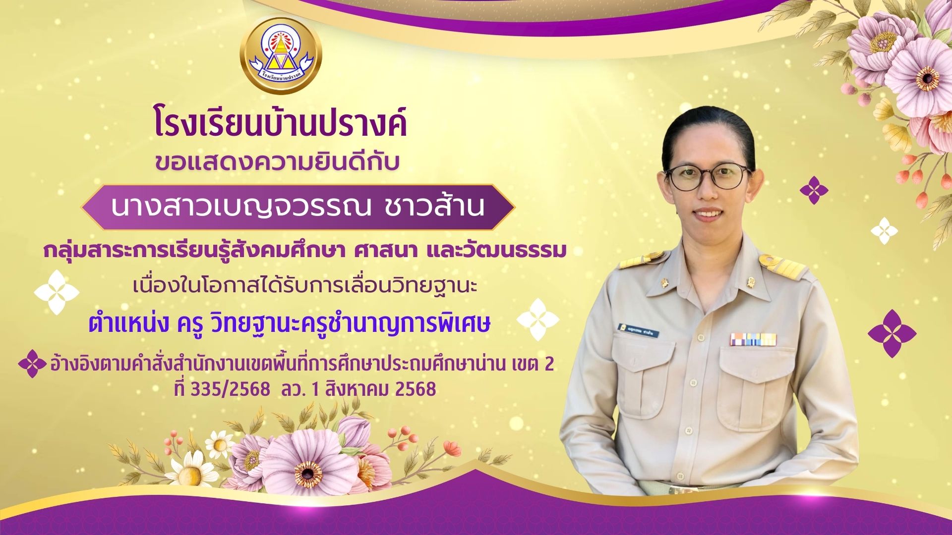 ขอแสดงความยินดีกับคุณครูเบญจวรรณ ชาวส้าน เนื่องในโอกาสได้รับการเลื่อนวิทยฐานะตำแหน่ง ครู วิทยฐานะครูชำนาญการพิเศษค่ะ