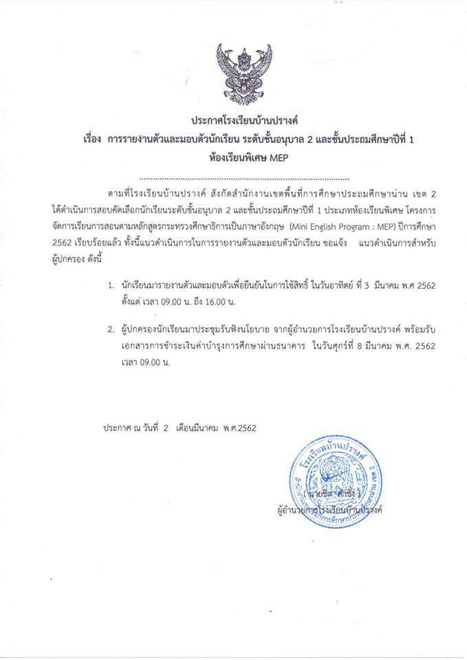 ประกาศโรงเรียนบ้านปรางค์ เรื่องการรายงานตัวและมอบตัวนักเรียนห้องเรียนพิเศษ MEP