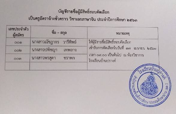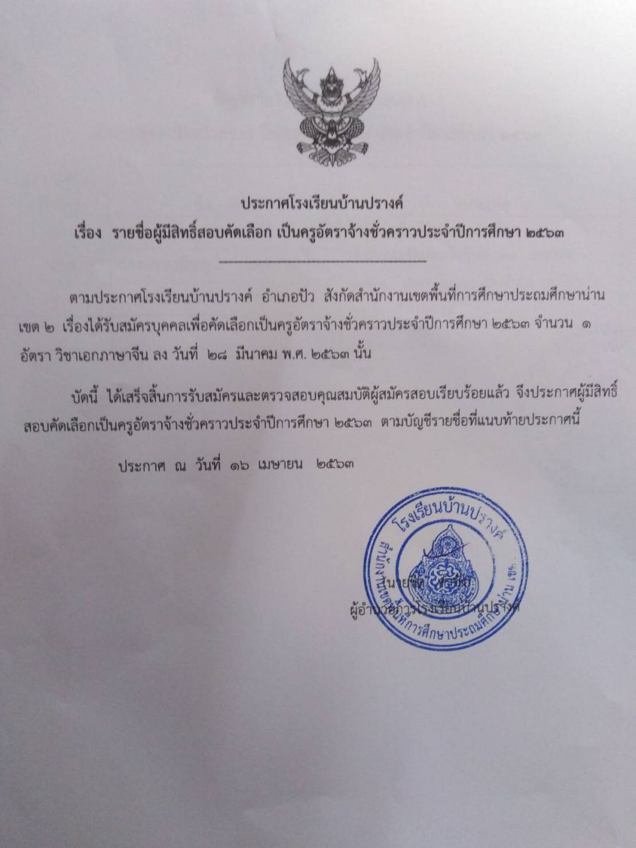 ประกาศรายชื่อผู้มีสิทธิ์สอบคัดเลือกเป็นครูอัตราจ้างชั่วคราว